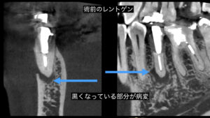 レントゲンの所見から、根尖性歯周炎が原因によるサイナストラクトであることが分かりました。顎骨の位置には穴が開いている状態でした。また、前回の根管治療にも問題があり、治療が不十分な状態でした。