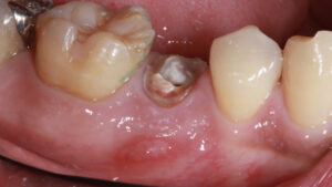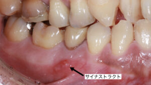 今回の症例は、サイナストラクトに対して精密根管治療で対応した症例です。サイナストラクトとは、歯の根元や歯茎にできる膿の袋や膿の出口です。ニキビや水ふくれのような見た目をしていて、指で押さえると膿が出てくることがあります。サイナストラクトの原因は、根の先端に膿がたまる根尖性歯周炎です。根尖性歯周炎を放置したことで、感染が広がって歯茎に膿の排出路であるサイナストラクトが形成されます。サイナストラクトは、自然に消失することはありません。サイナストラクトは、痛みなどの自覚症状がない場合もあり、歯科医院での検診で見つかることもあります。発見され次第、早急に治療する必要があります。