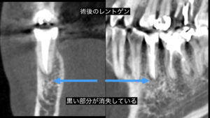 治療後3ヶ月のレントゲンで病巣の縮小傾向が見られる。歯茎にできたサイナストラクトも消失しました。