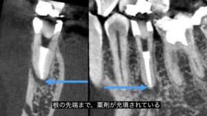 根管内が綺麗になったことを確認してから、根の先端までしっかりとMTAセメントを充填しました。