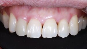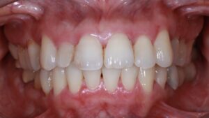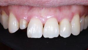 ダイレクトボンディングを行ったのちに、右上の前歯は仮歯を装着し、歯の形を調整しました。
