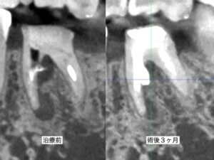 歯の根に穴が開いており、他院で抜歯と診断されるも精密根管治療にて歯の保存に成功した症例