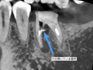 今回の症例では、レントゲンとCTによる診査によって、歯の根の部分に穴が開いている(パーフォレーション)ことがわかりました。