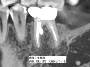 今回の症例は根の先端い病気があるだけでなく、パーフォレーションと言って根の一部に穴が開いてる状態でした。通常では、治療の成功率が低いため抜歯と診断されるような重篤な状態です。もし、治療がうまくいっても、病変の再発や歯根破折などにより再治療もしくは抜歯となってしまう可能性が高い状態です。